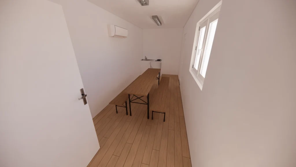 Base : Container maritime 40 pieds High Cube dernier voyage. Structure, parois et portes en acier Corten. Intégrité structurelle et étanchéité garanties. Plancher bois marine de 28 mm d’épaisseur.