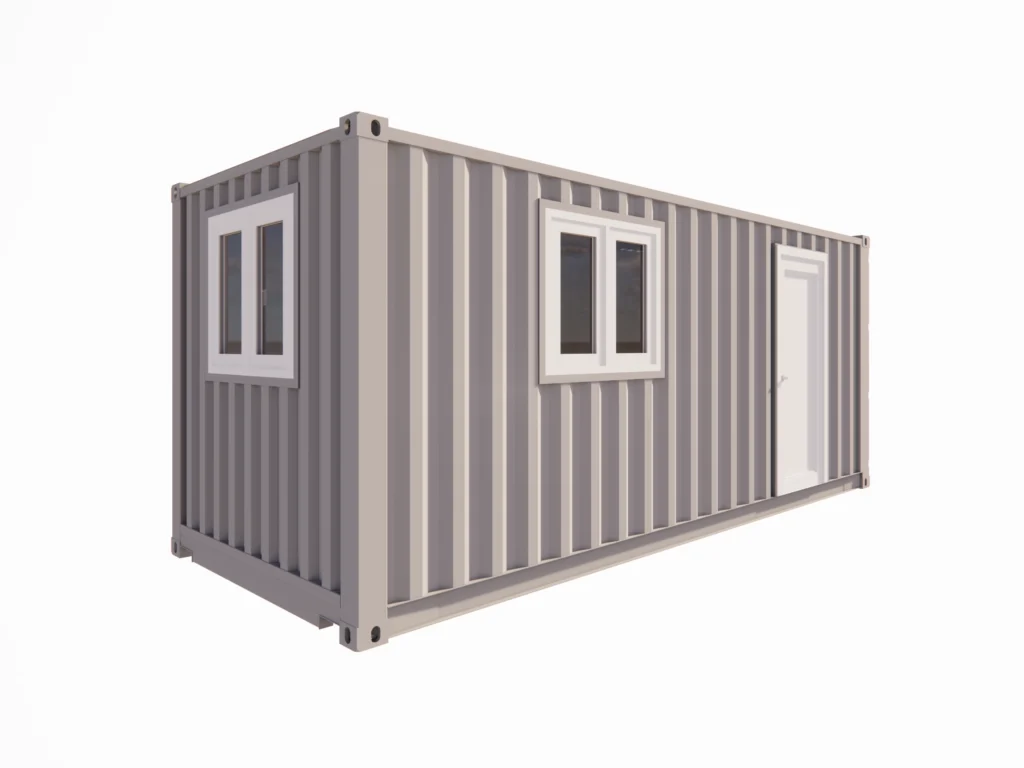 Base : Container maritime 20 pieds dry dernier voyage. Structure, parois et portes en acier Corten. Intégrité structurelle et étanchéité garanties. Plancher bois marine de 28 mm d’épaisseur.